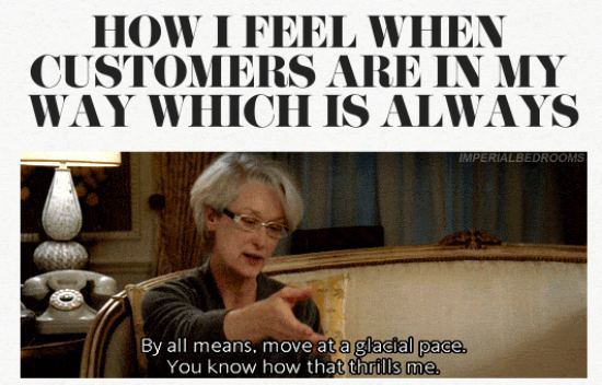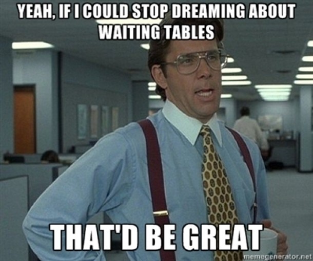 …. because you are only friends with servers and they don’t have the day off. You can get shit done. While the rest of the world is stuck in their 9-5 cubicle you can go to the drug store, the grocery store and hit the gym without ever feeling crowded. You also now only have two speeds, sprinting and sitting.